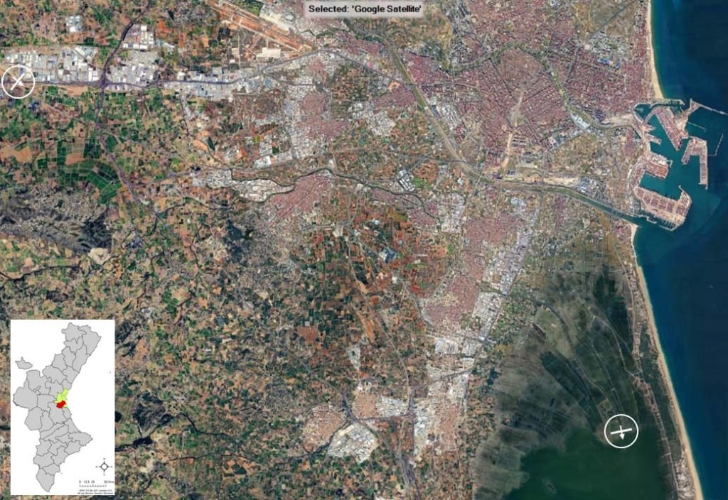 El área de estudio en este caso, desde el punto de vista de la búsqueda de desaparecidos, se centra en L’Horta Sud, la comarca del área metropolitana de Valencia situada al sur de la capital levantina (Zona 0). La comarca está formada por veinte municipios, muchos de los cuales se han visto afectados por el episodio. Desde el punto de vista hidrológico-hidráulico, el modelo se extiende desde el cruce del barranco del Poyo con la autovía A3, al noroeste, hasta la desembocadura en el lago de la Albufera, junto al Tancat de la Pipa, al sureste (véase imagen de la derecha).