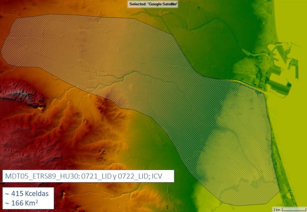El modelo se ha montado sobre la base del MDT de 5 m de resolución del Institut Cartogràfic Valencià (ICV), de descarga libre (https://geocataleg.gva.es/#/). La extensión de la malla de cálculo es de 166 km2 aproximadamente, con un número total aproximado de celdas de 415 000 (véase imagen de abajo). La celda tipo media es cuadrangular, de 20 m de lado, suficiente para el objetivo perseguido. Para la estimación de rugosidades se han tenido en cuenta los usos del suelo y el tipo de vegetación de las zonas de máximo interés. El coeficiente de rugosidad de Manning mayoritario en extensión ha sido de 0.035.