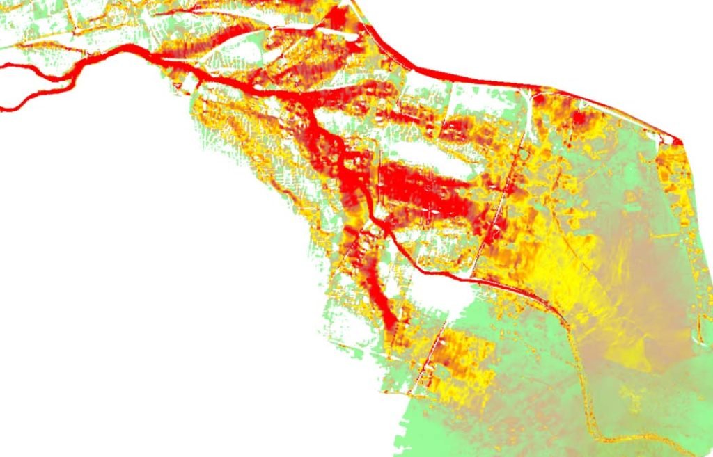No obstante, el resultado más importante desde el punto de vista del objetivo del estudio es el de la potencia hidráulica de la corriente como indicador de la capacidad de arrastre de esta. Por tanto, y verificada la bondad del modelo, se obtuvo la capa con el valor de dicha variable (véase la primera imagen de abajo) en la zona de interés. Como se puede observar, aparecen tres grandes corrientes de flujo desbordado (hacia el este) con una importante capacidad de arrastre (tonos más rojizos): una por el norte —la más delgada al norte de todas representa el nuevo cauce del Turia y no entra en este análisis—; otra por el centro y otra por el sur. Estos grandes brazos de flujo son coherentes con la compleja morfología de cono aluvial de la zona. Establecido el umbral de potencia hidráulica, se obtiene el mapa binario (zonas con valores por debajo y por encima) que, una vez superpuesto al campo de velocidades y trayectorias del flujo, nos permite visualizar las zonas de interés (véase debajo la imagen central) como posibles parcelas de localización potencial de desaparecidos (aquellas que, habiendo recibido una corriente de potencia suficiente, se han disipado y tienen un valor por debajo del umbral). De esta forma, se identifican parcelas como las indicadas, debajo, en la imagen de la izquierda.