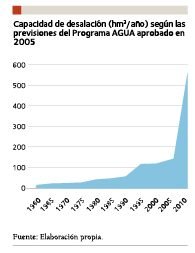 En realidad, esta modificación del plan no planteaba un cambio en la política territorial que asumían los trasvases, es decir, no reconsideraba la prioridad de mantener, e incluso incrementar, el regadío en el levante español, sino que se modificaba el origen del agua que se consideraba necesaria para ese regadío. La Ley 11/2005 incluye unos anexos de “Nuevas Actuaciones de Interés General” y de “Actuaciones prioritarias y urgentes en las cuencas mediterráneas”, que enumeraban una serie de plantas desaladoras que, en quince años, iban a aportar un volumen de agua anual muy semejante al que movilizaba el derogado trasvase del Ebro. Era el conocido como “Programa AGUA” (Actuaciones para la Gestión y la Utilización del Agua), que preveía una muy ambiciosa política de incremento de la desalación en España y que, a más corto plazo, en solo cinco años, pretendía cuadriplicar la capacidad de desalación. Al respecto, debe tenerse en cuenta que la mejora de las tecnologías de desalación, fundamentalmente la utilización de la ósmosis inversa, había hecho que el gasto medio energético para la producción de un metro cúbico de agua desalada hubiera descendido de los 7 kWh/m3, en 1980, a 5 kWh/m3, en 2000, estando actualmente en unos 3 kWh.