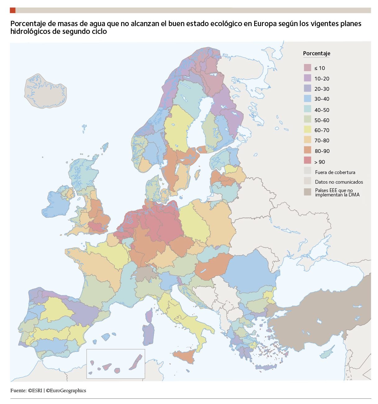 A pesar de que ya han transcurrido más de veinte años desde la entrada en vigor de la Directiva Marco del Agua, sus objetivos distan mucho de haberse conseguido. Según datos de la Comisión Europea y de la Agencia Europea de Medio Ambiente, en 2018, solo el 40% de las masas de agua superficial europeas alcanzaban el buen estado. Este porcentaje era sensiblemente mejor para las aguas subterráneas, que lo hacían en un 70%. En ese mismo año, el porcentaje de masas de agua superficiales en buen estado en España era mejor que el de la media europea, pues alcanzaba un 58%. Sin embargo, con una calidad bastante inferior al resto de Europa, solo lo hacían el 55% de las subterráneas.