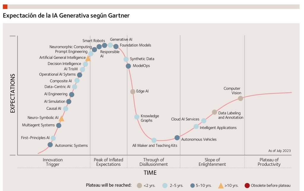 La IA generativa (6) (IAG) es, sin embargo, el inicio industrial de una tecnología que ha «explotado» en forma de cientos de nuevas aplicaciones diarias (7). Gran parte de ellas (en su mayoría basadas en los modelos GPT) aún requieren de mucha exploración y testeo y de cierta destreza para poder extraer sus beneficios tangibles a corto plazo.