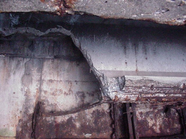En la fotografía siguiente de la misma figura se observa el colapso que sobrevino al circular una carretilla sobre uno de los vanos con apoyo en el muro-estribo. La forma de la rotura no era indicativa de un fallo por flexión (por ejemplo, la armadura inferior en la zona central de vano no presentaba anomalías significativas). La armadura estaba rota en el extremo del lado del muro-estribo, con síntomas de estricción en algunos casos (en otros, la armadura había perdido prácticamente toda la sección por la corrosión).