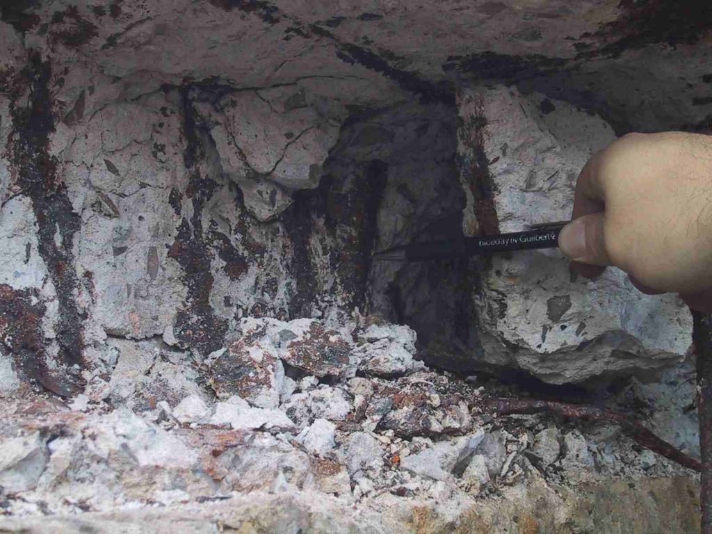 - una reducción de la sección útil a causa de la pérdida del hormigón de recubrimiento y la consiguiente pérdida de sección, que en algunos casos puede no ser despreciable desde el punto de vista de la capacidad resistente.