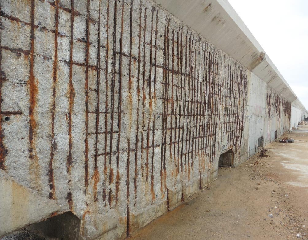 En la figura 9 mostramos un caso que estudiamos para el Consorcio de Compensación de Seguros. En un temporal se produjo un fallo en un tramo de un espaldón de hormigón armado entre juntas de dilatación. En la misma figura se muestra la intensa corrosión que presentaba la armadura del espaldón.