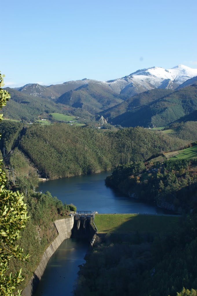 Sirva como ilustración del paisaje hidráulico creado por el hombre, en este caso modesto pero coquetón y bello, la vista desde lo alto de la pequeña-gran presa hidroeléctrica de Arbón, (33 m, 56 MW) sobre el río Navia, en el occidente de Asturias. Obra meditada, proyectada y construida en 1967 por Juan José Elorza para Electra del Viesgo.