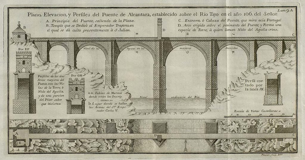 Puente de Alcántara en Extremadura (106 d. C.). Sobre la fábrica de puentes. (1769). M. Sánchez Taramas. Fuente: Fundación Juanelo Turriano.