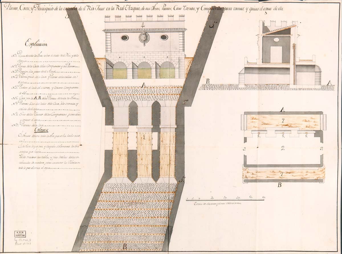Planta, corte y frontispicio de la entrada del río Júcar en la Real Acequia. España Fuente: Ministerio de Cultura. Archivo Histórico Nacional.