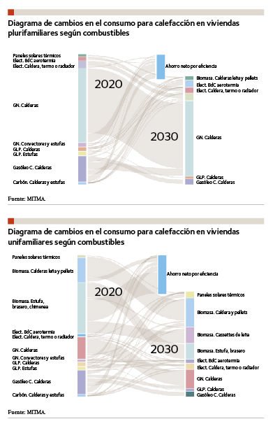 En las figuras adjuntas se resumen los objetivos de consumo de energía final en el sector residencial —para todos los usos: calefacción, ACS, iluminación, cocinas, etc.—, de acuerdo con la ELP 2050.