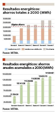 Como puede verse en la figura contigua, los Escenarios A (Tendencial) y B (Sólo Instalaciones) no consiguen alcanzar los objetivos energéticos planteados por el PNIEC, de manera que -en todo caso- es necesario añadir las intervenciones sobre la envolvente.  Con el Escenario C (Base) ya se pueden conseguir estos objetivos, siendo posible optimizar los resultados–manteniendo el volumen de viviendas a rehabilitar y la inversión total- mediante la aceleración del ritmo inicial y la concentración de las actuaciones sobre el parque más ineficiente. La combinación de ambas optimizaciones (Escenario F) podría llegar a mejorar los resultados acumulados en un 20% extra.