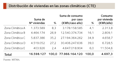 La ERESEE 2020 comienza realizando un diagnóstico y análisis detallado de los 18,7 millones de hogares o viviendas principales existentes en España, en el que lo primero que destaca son las importantes diferencias existentes en el consumo por vivienda según zonas climáticas, que —como se aprecia en el mapa y en la tabla de distribución de viviendas en las zonas climáticas— llega a ser del orden de cinco veces superior en unas zonas y otras.