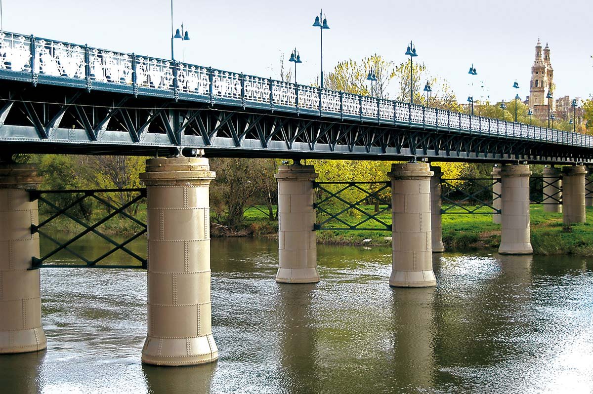 Se trata de un proyecto singular, tanto por la importancia de las luces a salvar — dos vanos de 90 m sobre el río Ebro— como por las exigencias formales que se derivan del entorno histórico y paisajístico en que se ubica la obra, lo que aconsejó proyectar una estructura de gran esbeltez y máxima transparencia que redujera el impacto sobre el entorno. La estructura proyectada fue una celosía mixta con un canto fuertemente variable entre 1.55 m en centro de vano y 8.55 m en apoyos. Este gran canto en la zona sobre apoyos se aligera visualmente acudiendo a dos almas laterales en celosía metálica, con una losa superior de hormigón pretensado con cables rectos y un cordón inferior comprimido constituido por una chapa metálica de fondo conectada a una tabla inferior de hormigón de 30 cm de espesor. En los 30 m centrales de los vanos principales la doble celosía se transforma en un cajón unicelular mixto trabajando a flexión positiva. El montaje se realizó con ayuda de grúas y apeos sobre penínsulas de tierra en el cauce del río, con el soldeo de subtramos metálicos transportados desde los talleres Callfer, S. A. de Madrid.
