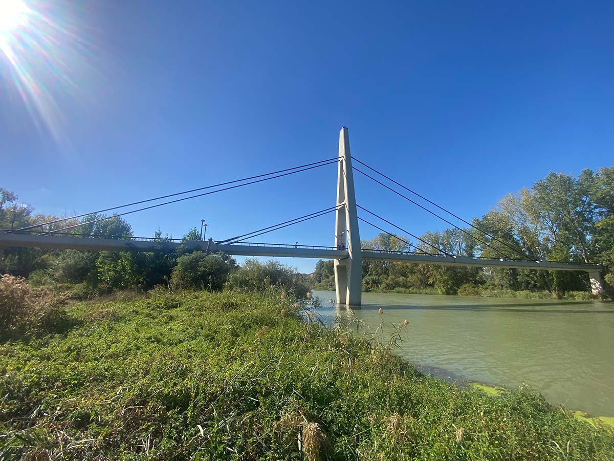 La solución atirantada se adaptaba para salvar las condiciones de los 220 m del salto sobre el Ebro: un soto inundable con importantes crecidas varias veces al año y un cauce permanente con fuerte caudal, de aproximadamente unos 60 m. La pasarela tiene una longitud total de 231 m, con 8 vanos de 21 m con apoyos sobre el cauce de avenidas y un tramo atirantado de 63 m sobre el cauce de aguas normales. La pasarela atirantada tiene un pilono único en forma de diamante, dos planos de tirantes en arpa con 2 x 2 tirantes a cada lado del pilono que, de un lado, sostienen al vano principal y, del otro, se anclan sobre pilas de retenida, confiriendo así la necesaria rigidez a la estructura. La sección transversal de la pasarela tiene forma de artesa, de 1 m de canto y 3,90 m de ancho total, con dos nervios laterales donde anclan los tirantes y se aloja la barandilla.