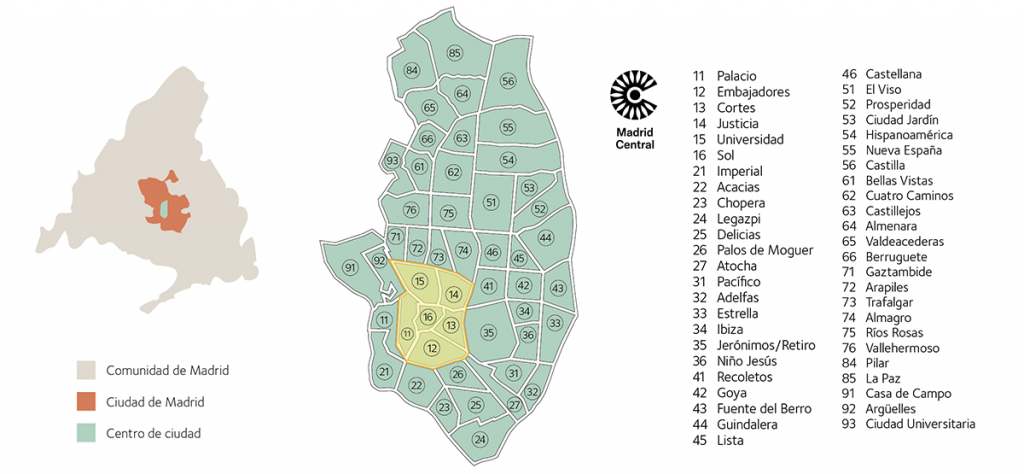 Para abordar el problema de la calidad del aire local, en 2018 se implementó una LEZ conocida como Madrid Central (ver Figura 1), cuya extensión es de aproximadamente 5 km2. Esta medida se incluía en el Plan A de calidad del aire (2017). Madrid Central pretende promover una movilidad más sostenible en la ciudad, reduciendo el uso de los vehículos privados y promoviendo el transporte público y el transporte no motorizado. De esta manera, se espera crear un centro de ciudad más sostenible e inclusivo.