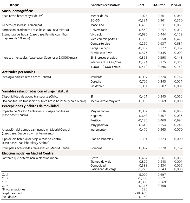 Con base en la encuesta se ha estudiado el cambio modal de los usuarios de vehículo privado (principal grupo afectado por la LEZ) mediante el modelo de elección discreta logit ordenado (Train, 2009). La muestra se restringe a los 380 encuestados que indicaron que utilizaban el vehículo privado para acceder al área de Madrid Central antes de su implementación. El cambio modal tras la puesta en marcha de Madrid Central se ha definido como una variable discreta ordenada de la siguiente manera: