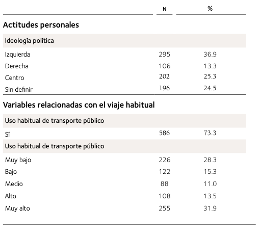Entre los encuestados, un 36,9% de los ciudadanos declara ideología de izquierdas, un 13,3% de derechas y un 25,3% de centro. En lo que respecta al uso habitual del transporte público, se distinguen tres grupos diferenciados. El primero de ellos declara utilizar muy poco el transporte público (28,3%); el segundo grupo muestra un uso moderado; y el tercero señala un elevado uso del transporte público en sus viajes habituales (31,9%). A pesar de esta distinción, es importante indicar que el 73,3% de los encuestados dispone de abono de transporte público.