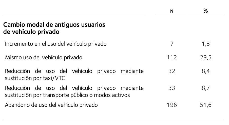 El modelo también señala la disponibilidad del abono y el uso intensivo de los sistemas de transporte público como variables explicativas del abandono y reducción del vehículo privado. Precisamente este es uno de los objetivos de las LEZ, por lo que el modelo indica el éxito de la promoción del transporte público para conseguir atraer a los usuarios del vehículo privado.