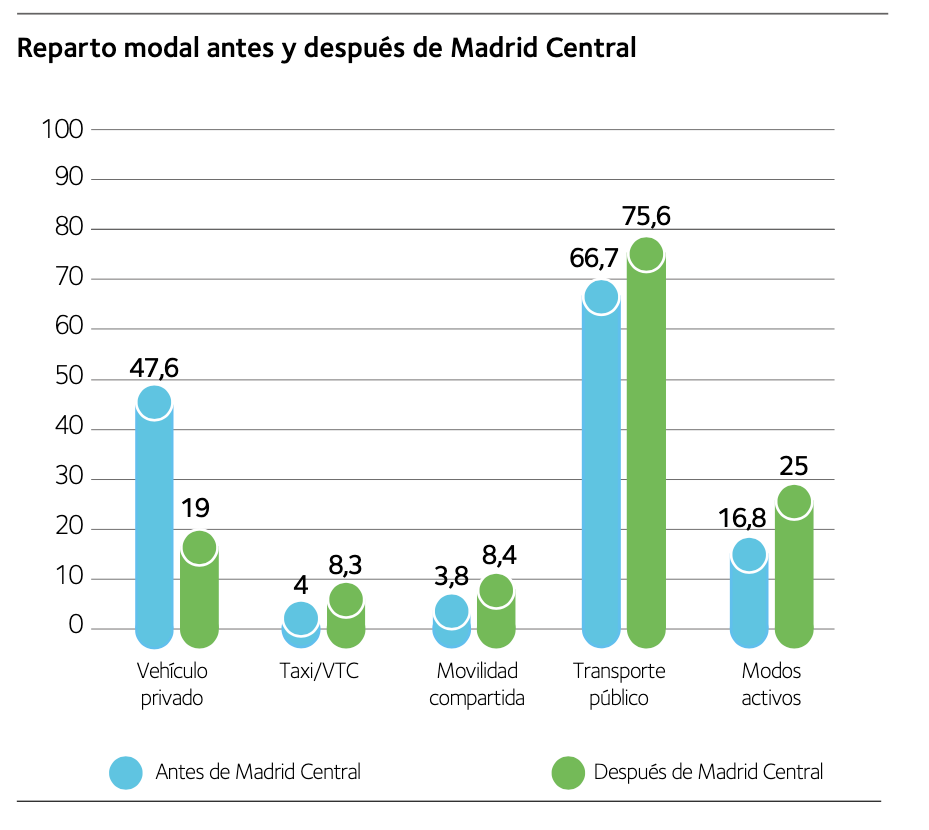 El transporte público y los modos activos son los principales beneficiados tras la implementación de Madrid Central, siendo las principales alternativas al vehículo privado. En el caso del transporte público, su cuota modal se incrementó desde el 66,7% previo a la implementación de Madrid Central, hasta el 75,6% tras su implementación. Por su parte, los modos activos (caminar y/o ir en bicicleta) vieron crecer su cuota modal desde el 16,8% hasta el 25%. Además, modos de transporte minoritarios como el taxi-VTC y los servicios de movilidad compartida consiguieron doblar su cuota modal desde el 4% al 8,3% en el caso del taxi/VTC y, desde el 3,8% hasta el 8,4%, en el caso de los servicios de movilidad compartida.