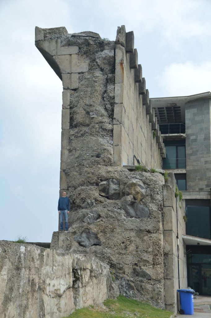 La estructura en Málaga fue de costillar; se usaron arbotantes góticos en un espaldón de paramento curvo para conseguir un choque ventilado con visuales interiores que invitan al paseo, e incluso a montar en bicicleta. En la fotografía se ve al profesor Leo Franco de la Universidad de Roma 3 disfrutando de un paseo por los arcos del borde sólido de la capital de la costa del sol (Figura 12).