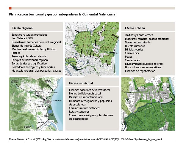 Estas áreas, junto a los jardines, los parques públicos urbanos y las superficies de agua (incorporando puntos de hidratación, espacios de sombra y vegetación), que son cruciales para el confort climático en las ciudades ante fenómenos extremos, deben integrarse en corredores ecológicos (infraestructuras verdes) que faciliten el confort climático y la reducción de la exposición a la contaminación del aire, absorción de carbono, reducción del ruido y mejora de la salud por alivio del estrés y por facilitar una mayor actividad física e interacción social.