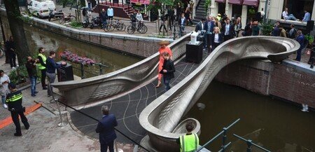 Este es el primer puente impreso en 3D que se destina al uso público de peatones y ciclistas; está ubicado en el Barrio Rojo de Ámsterdam y ha tardado seis meses en ser construido por cuatro robots industriales.