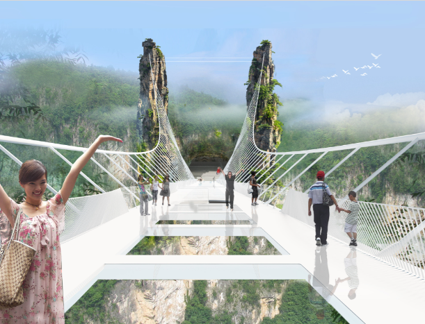 Con 430 metros de longitud, es el puente con suelo de vidrio más largo del mundo; suspendido a 260 metros de altura, se extiende entre dos acantilados montañosos sobre un profundo cañón en el parque forestal nacional de Zhangiajie, en la provincia de Hunan, en China.