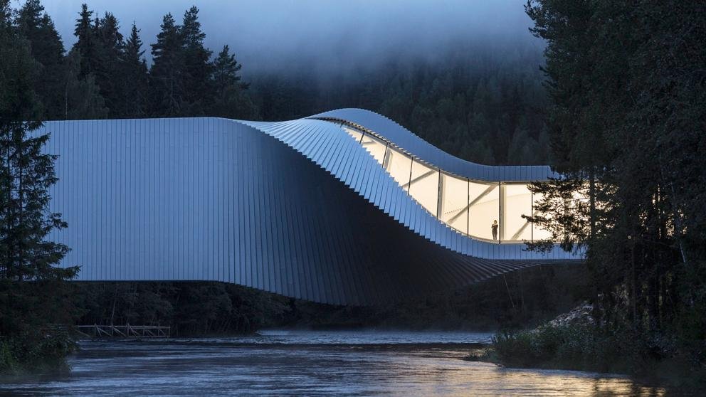 Ha sido diseñado por el prestigioso estudiode arquitectura danés Bjarke Ingels Group, BIG, y desde su inauguración en 2019 no ha dejado de sorprender por su arriesgada propuesta de torsionar un enorme bloque de vidrio y aluminio de 60 metros de largo que unelas dos orillas del río Randselva y que alberga un museo de arte contemporáneo.