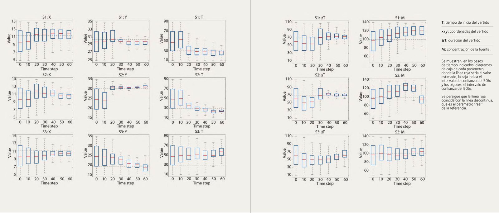 Retomando los casos sintéticos de la figura 3, partiendo del desconocimiento total de la distribución espacial de las conductividades y asumiendo que la fuente puede estar dentro de los rectángulos que se ven en la figura, el filtro de Kalman de conjuntos aplicado en sesenta instantes de tiempo (es decir, las ecuaciones anteriores fueron aplicadas sesenta veces), tras sesenta medidas de piezometría y concentración en los 25 piezómetros de observación, es capaz de producir una estimación de las conductividades junto con una varianza de la estimación como se observa en la figura 4. Los resultados son espectaculares, especialmente considerando que, de partida, no se tenía información sobre la distribución de las conductividades. La figura 5 muestra la evolución de los parámetros que describen la fuente de contaminación estimados en el conjunto de realizaciones usando diagramas de caja, donde se observa que tras la última observación (paso de tiempo 60) los valores estimados (líneas rojas) son próximos a los reales (línea negra discontinua) y, en general, la incertidumbre, medida por el ancho de los bigotes, disminuye con el tiempo.