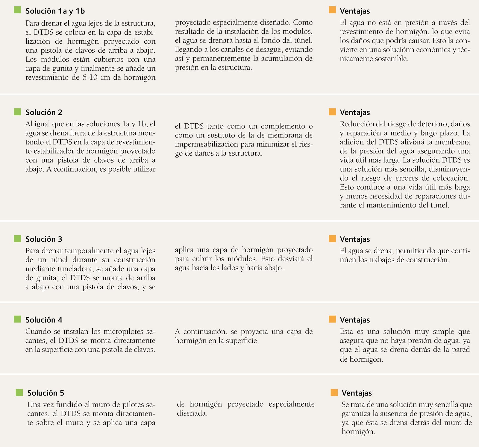 El presente documento se articula de la siguiente manera. La sección 2 describe ejemplos de soluciones disponibles para hacer frente a la presión del agua en los túneles hoy en día y los desafíos individuales que representan. La sección 3 proporciona información sobre cómo implementar el DTDS en las soluciones existentes y los efectos para el túnel. Las ventajas se describen desde un punto de vista técnico, económico y ambiental. Por último, la sección 4 resume el documento con sus conclusiones.