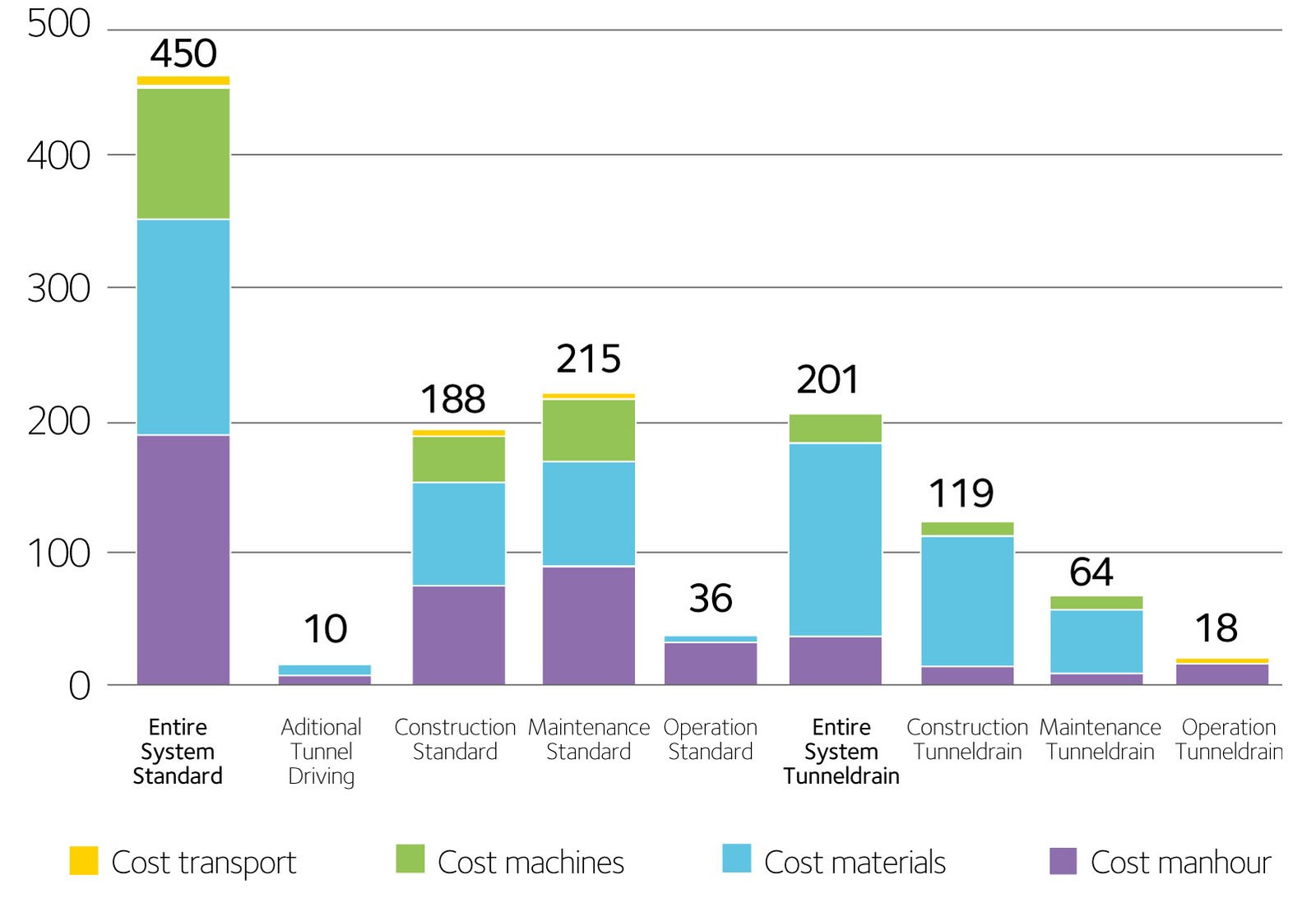 El sistema de drenaje del túnel Dolenco no sustituye directamente las soluciones estándar disponibles hoy en día. Es un complemento a las soluciones existentes, porque mejora el comportamiento general del túnel de varias maneras. Se espera que la reducción de costos de la construcción sea del 40 por ciento y la reducción general de costos sea del 55 por ciento, en comparación con las soluciones estándar disponibles hoy en día. Además, hay una reducción de energía del 40 por ciento al cambiar de un sistema de drenaje convencional al sistema de drenaje del túnel Dolenco.