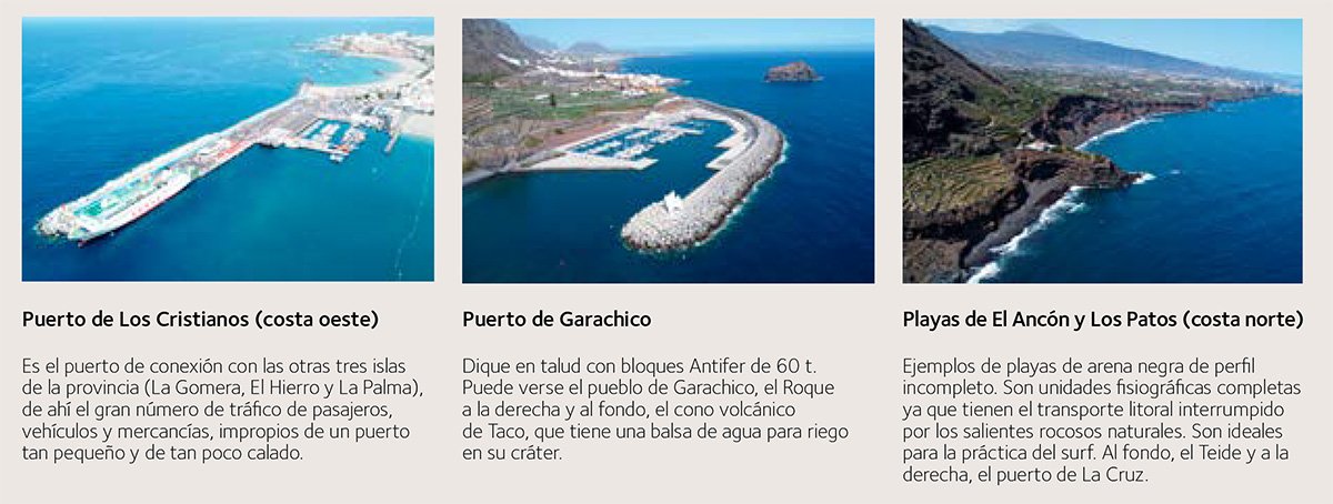 Una de las características físicas típicas de las islas volcánicas en general es que presentan una plataforma costera reducida, que contrasta con las grandes plataformas costeras de los continentes. Tenerife no es una excepción. Hay puntos de su costa en los que la batimétrica ‑1000 está a menos de una milla de la costa. Esta circunstancia hace que solo dos de sus 90 obras marítimas —en concreto, los puertos de Santa Cruz y de Granadilla, ambos en la costa este—se hayan construido en aguas de transición, estando todas las demás ubicadas en aguas someras, por lo que quedan sometidas a situaciones de rotura en temporales.