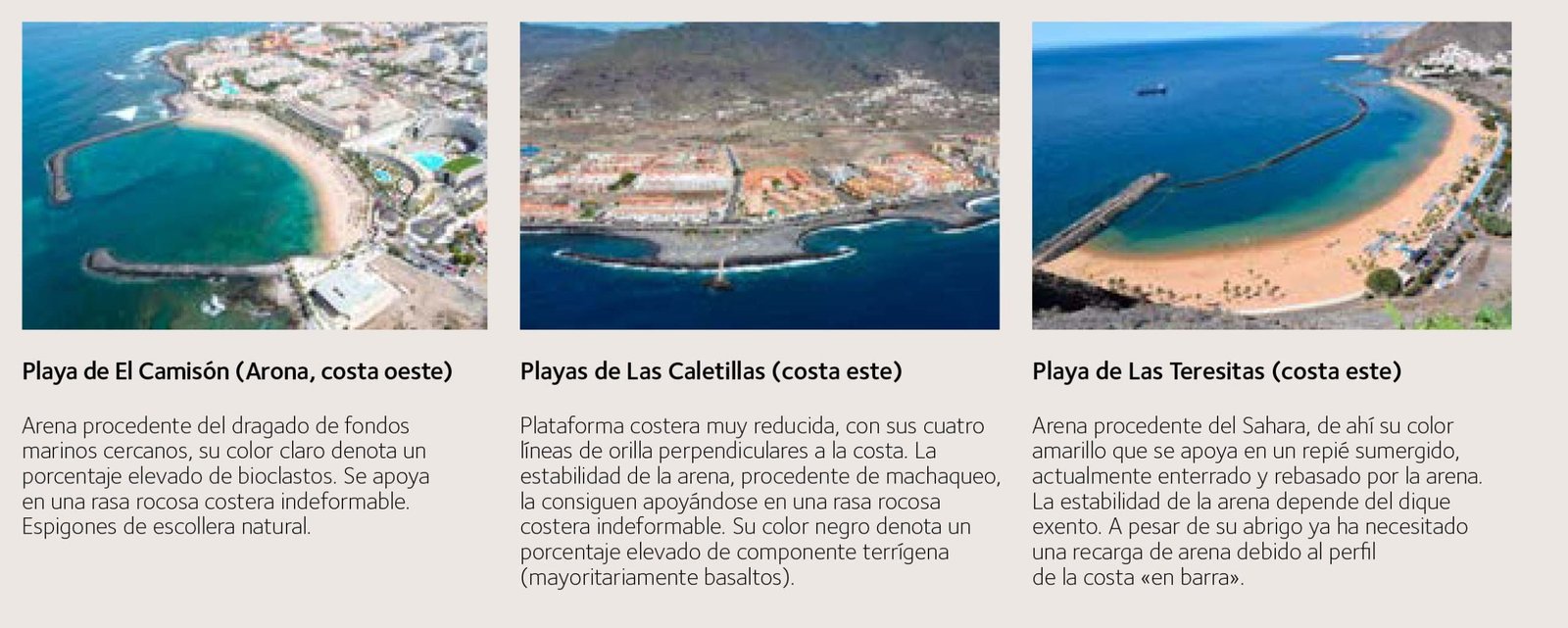 Además, en Tenerife, y en Canarias en general, es frecuente la existencia de playa estacionales, es decir, playas que en una época del año tienen arena y en otra, esta es sustituida por gravas y bolos. Esto se debe a que el perfil de la costa frente a la playa tiene una forma tal que para el régimen de temporales que se presente acumula sedimento en la orilla (perfil en escalón) durante una época del año, mientras en el régimen de otra época erosiona el sedimento transportándolo hasta una barra sumergida. En alguna playa transporta la arena y en otras, las gravas.