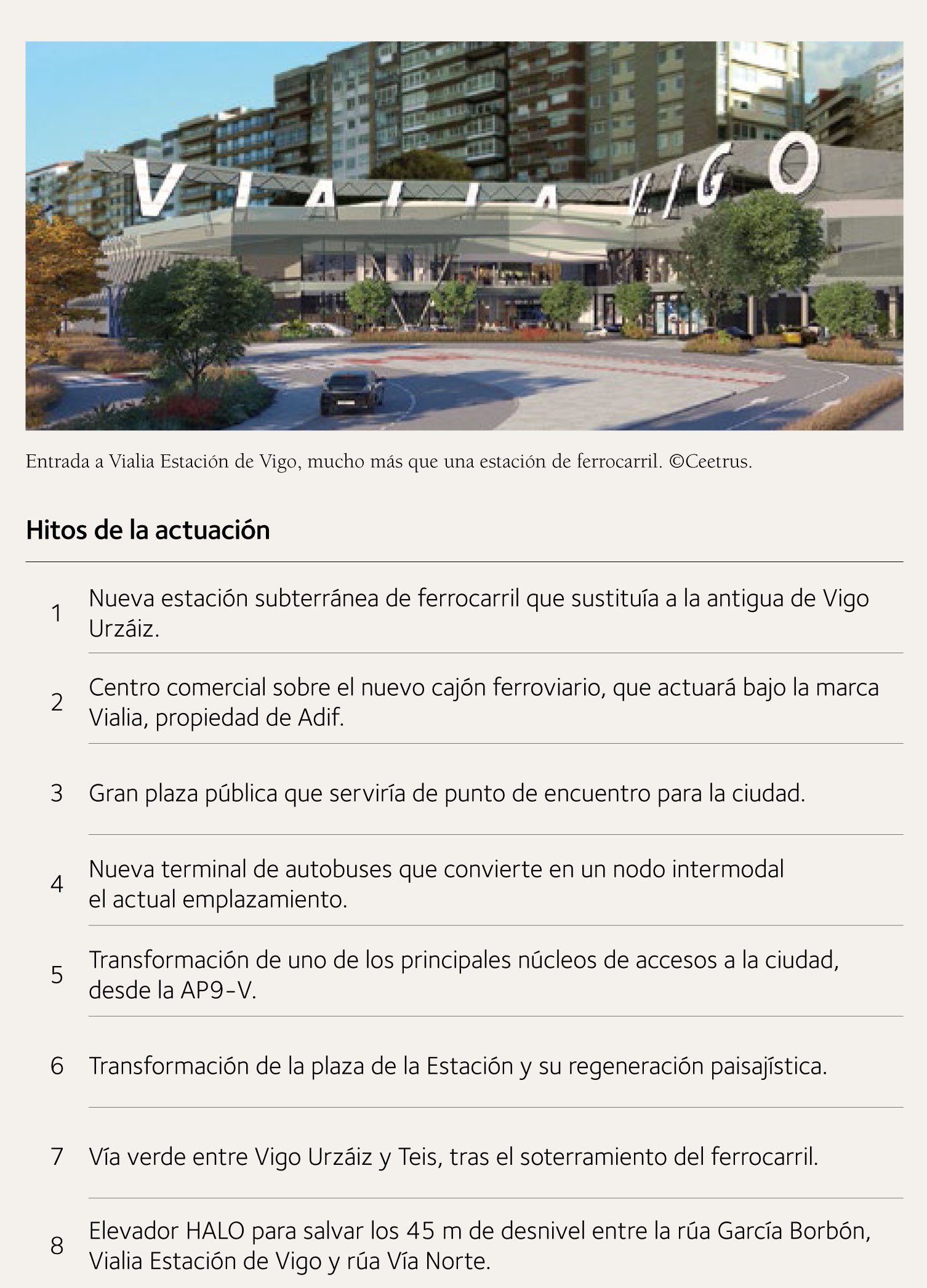 En Vigo no resulta sencillo alumbrar nuevos espacios. Es una ciudad constreñida por el mar a un lado y por la montaña al otro, con unas pendientes muy pronunciadas. De entrada, las Administraciones se pusieron de acuerdo en soterrar la estación de Vigo-Urzáiz (inaugurada en 1878) y construir la nueva 15 metros por debajo de la anterior, algo que ha permitido generar suelo para acometer nuevas actuaciones, entre ellas, la construcción de un centro Vialia. Esta marca, propiedad de Adif y Adif Alta Velocidad, se emplea para la explotación comercial de algunas de sus grandes estaciones ferroviarias: ocio, cultura y comercio se unen al transporte en grandes terminales de carácter funcional y atractivo. Vialia está orientada tanto al viajero ferroviario como al resto de ciudadanos de una zona. Se trata de generar, en torno a la estación, una conexión entre el servicio de transporte ferroviario y las necesidades de la ciudad en términos comerciales. Se dota a la estación de contenido, ya sea dentro de ella o generando espacios nuevos en su área de influencia. Entre las categorías comerciales presentes destacan restauración, moda, regalos, deportes y aventura, prensa, alquiler de coches, agencias de viajes, cosméticos, telefonía, perfumería…; una combinación de establecimientos conocidos a escala nacional con comercios independientes y negocios locales. Actualmente la marca Vialia se puede encontrar también en Pontevedra, Salamanca, Bilbao-Abando Indalecio Prieto, Málaga-María Zambrano y Albacete-Los Llanos.