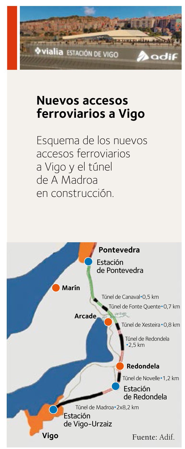 Para la conexión con el Eje Atlántico, en su entrada a Vigo, se ha excavado un nuevo túnel bitubo de 8 km, conocido como el túnel de A Madroa, que parte desde la localidad de Redondela y que en sus últimos tramos recorre Vigo bajo su superficie.