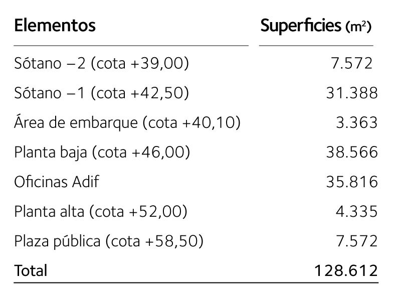 Superficies de las distintas plantas de la nueva estación