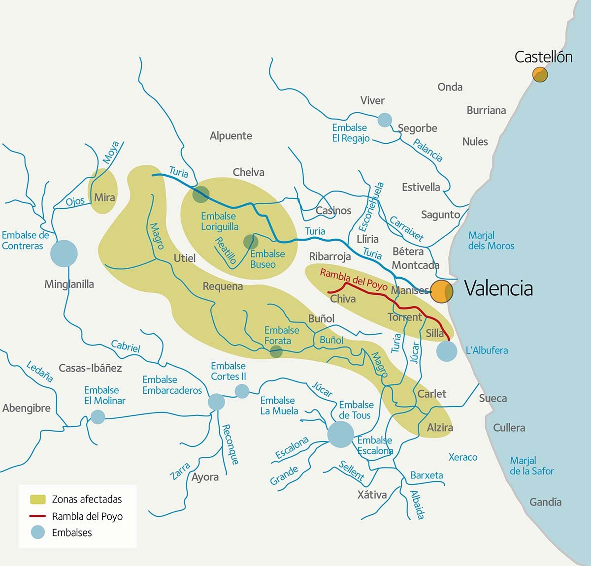 Para el día 29 de octubre de 2024 se anunciaba una DANA sobre la provincia de Valencia con fuertes precipitaciones. Efectivamente, a primeras horas de la mañana se produjeron lluvias muy intensas en una zona interior de Valencia, cercana a la provincia de Cuenca. Esas montañas vierten a varios ríos que nacen en las mismas, por lo que, en realidad, no se produjo una única inundación, sino que podemos identificar al menos cuatro. Aunque todas con un origen común en la precipitación, con un discurrir diferente según los diversos cauces.