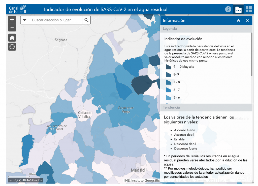 Desde febrero de 2021, la información está a disposición de los ciudadanos en la páginaweb de Canal de Isabel II, pudiendo consultarse a través de un mapa interactivo (imagen adjunta) que muestra la persistencia del virus en el agua residual por municipios y que se actualiza dos veces por semana. En el mapa, un código de colores cuantifica la importancia de la presencia del SARS-CoV-2 en función de la tendencia en cada municipio/distrito (ascendente, descendente.…) y el valor absoluto comparado con los datos históricos de este municipio/distrito.