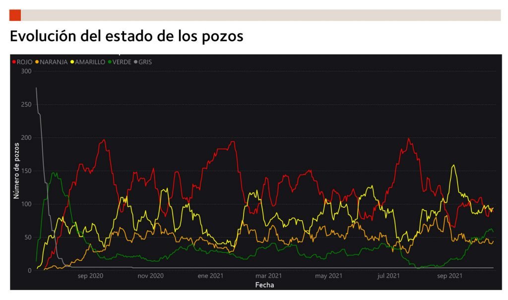 - Naranja: pozos con tendencia decreciente de la media móvil con una variación no mayor del 33%.
