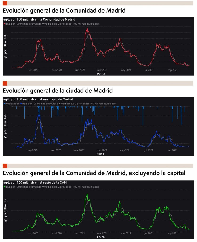 Igualmente está disponible un informe de presencia de SARS-CoV-2 en el agua residual, que se actualiza semanalmente y que, además de la evolución del estado general de los puntos de muestreo ya mencionada, incluye los gráficos de evolución general para toda la Comunidad de Madrid, Madrid capital y resto de la Comunidad de Madrid como se muestra abajo. Dado que no se puede establecer una relación única entre el valor de SARS-CoV-2 en aguas residuales y el número de infectados, ya que dependerá de la virulencia de la infección en cada paciente, Vigía no muestra valores absolutos, sino tendencias.