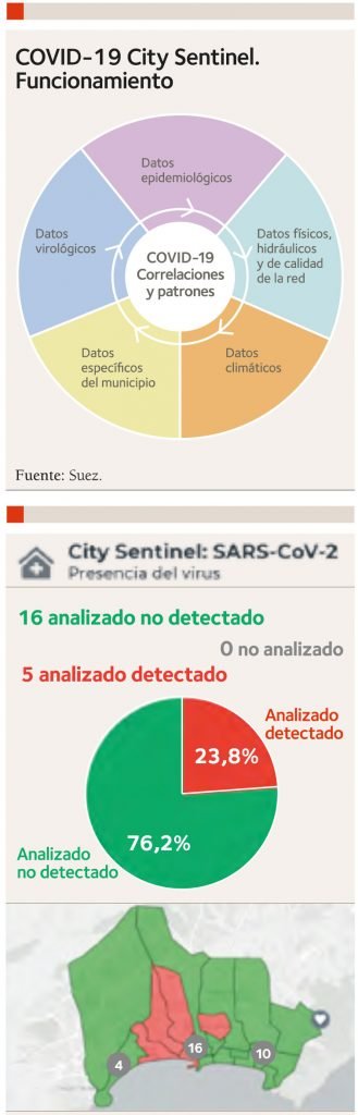 El grupo Suez lleva un año implantando la solución integrada COVID-19 City Sentinel en numerosas redes de saneamiento. El servicio consiste esencialmente en monitorizar de forma periódica la presencia de material genético del virus SARS-CoV-2 en las aguas residuales de un municipio, como observatorio o centinela de la enfermedad, que ayude al gestor público en la toma de decisiones, pudiendo así sectorizar medidas y controlar nuevos focos.