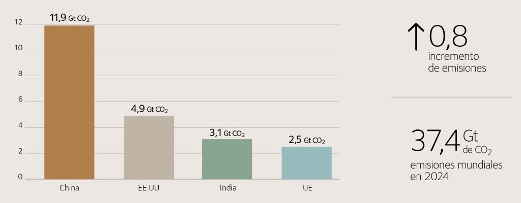 Por otra parte, las emisiones mundiales en el año 2024 han sido de 37,4 GtCO2, un 0,8% superiores a las de 2023, a las que habría que añadir 4,2 GtCO2 derivadas de cambios en el uso de la tierra, un 2,4% superiores a las correspondientes en el período 2014-2023, lo que nos aleja cada vez más de la posibilidad de alcanzar los objetivos del Acuerdo de París: conseguir que el incremento de temperatura en la temperatura de la Tierra esté considerablemente por debajo de 2ºC sobre la temperatura preindustrial y realizar los mayores esfuerzos para que no supere los 1,5ºC.