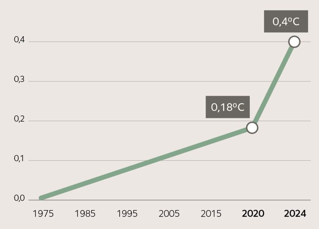 De lo anterior se deduce que la temperatura en la Tierra permanecerá por encima de +1,5ºC a finales de 2024 (5) y, como máximo, podría estar ligeramente por debajo de +1,5ºC en 2025. Por lo que, dado que el aumento de temperatura se incrementará, probablemente, entre +0,2 y +0,3ºC por década, la temperatura global alcanzará +2ºC en 2045.