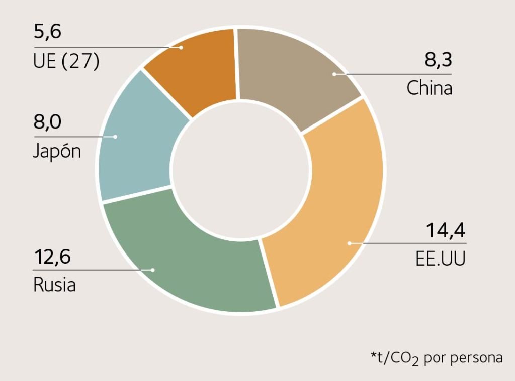 China fue el país máximo emisor en 2023, con 11,9 GtCO2, seguido de EEUU, con 4,9 GtCO2, de India, con 3,1 GtCO2 y de la UE 27, con 2,5 GtCO2. A su vez, en cuanto a las emisiones “per capita” de 2023, EEUU fue el país en el que fueron más elevadas, con 14,4 t CO2/persona, seguida de Rusia, con 12,6 t CO2/persona, de China, con 8,3 t CO2/persona, de Japón, con 8,0 t CO2/persona y de la UE 27, con 5,6 t CO2/persona (“Global Carbon Budget 2024”),