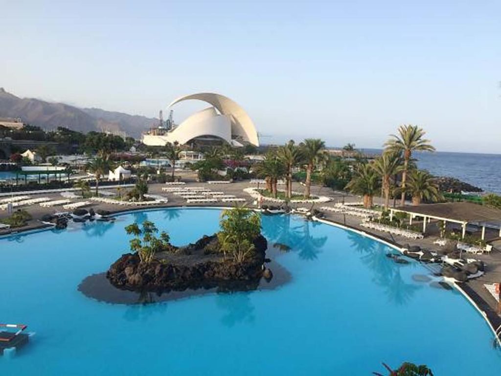 La piscina principal del Parque Marítimo con el Auditorio, obra de Santiago Calatrava, al fondo. Fuente: Sociedad de Desarrollo Local de SCT.