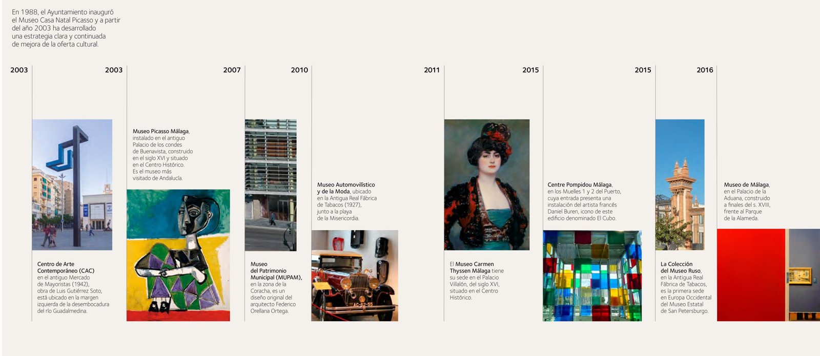 Apoyándonos en el Centro de Arte Contemporáneo, que abría sus puertas en febrero de 2003, y en el Museo Picasso, que se inauguraba en octubre de ese mismo año; se fue completando luego con el Museo del Patrimonio Municipal, el Museo Carmen Thyssen Málaga y el Museo del Automóvil y la Moda, aprovechando la oportunidad que nos dio el cierre de la fábrica de Tabacalera.