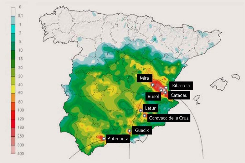 El 29 de octubre, la estación de la Agencia Estatal de Meteorología (AEMET) en el embalse de la Fuensanta, a unos 10 kilómetros hacia el noroeste de Letur, en Albacete, registró 149,6 l/m² en 24 horas, de los que 46 l/m² se recogieron en una hora, y 25,6 l/m² en tan solo 10 minutos.