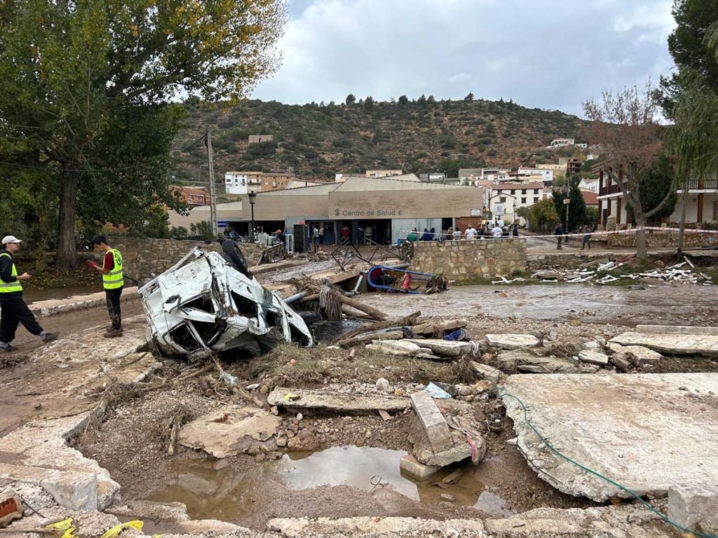 La orografía jugó a favor del pueblo conquense, cuyas calles empinadas favorecieron el paso del agua evitando las inundaciones. Sin embargo, las lluvias dejaron la localidad sin conexión directa a Valencia por carretera, debido a que el río Ojos de Moya dañó el puente perteneciente a la carretera provincial que da acceso a la localidad por el sur y los caminos que van a las huertas. También ha habido problemas graves en el saneamiento y la depuradora municipal ha desaparecido a causa de la riada.