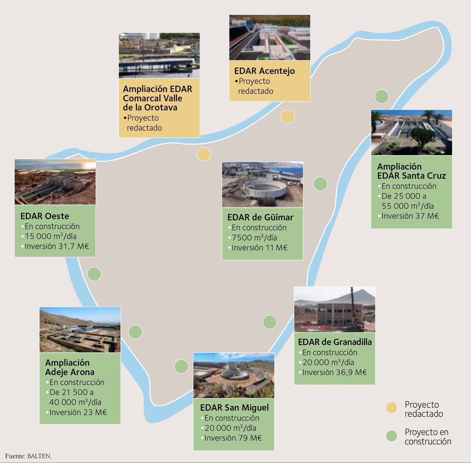 Actualmente, la infraestructura BALTEN la compone un total de 21 balsas de riego, con una capacidad total de almacenamiento de más de 5,1 hm³; tres desaladoras con tecnología EDR (electrodiálisis reversible), dos de agua depurada y una de agua salobre; 1500 kilómetros de conducciones y tuberías de transporte y distribución; tres pozos; una galería de agua subterránea; y más de 11 500 abonados para el suministro de agua de riego en Tenerife. Es de destacar la importante dispersión de los más de 11 500 puntos de suministro gestionados por BALTEN y su distribución, concentrada entre la costa y la cota 600 m s. n. m.