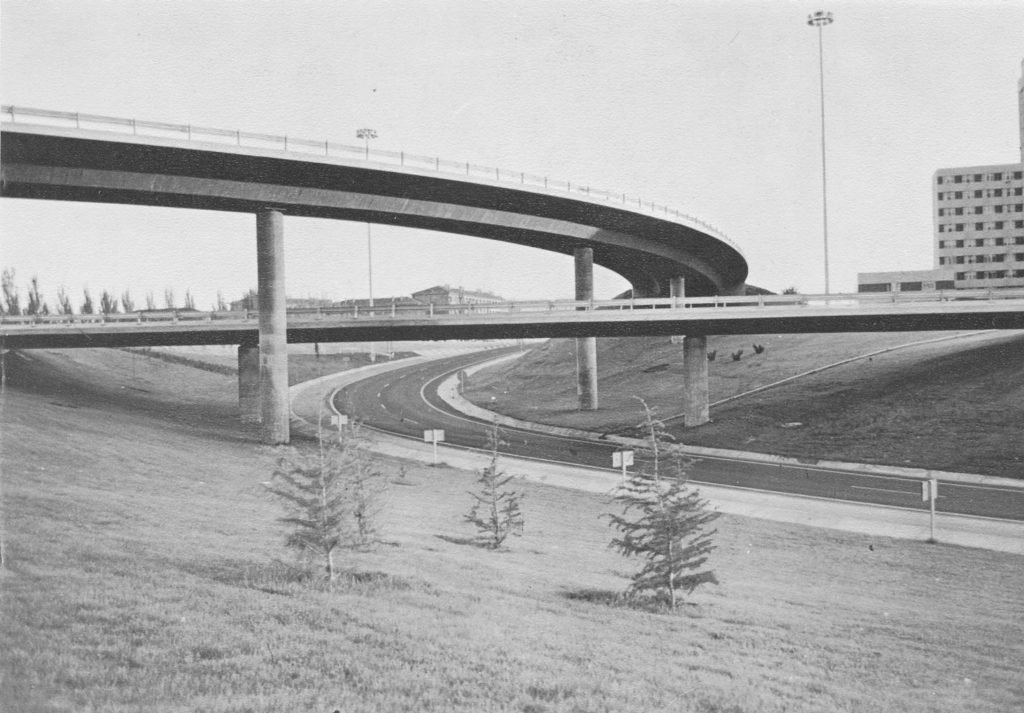 En una primera época, el trabajo en la oficina consistió en los proyectos que le llegaban a don Carlos y que nosotros desarrollábamos. En 1964 se hicieron los pasos superiores de la autopista de las Rozas a Villalba. Era el inicio de las autopistas en España, y por ello podemos decir que los pasos superiores eran un tipo de obras nuevas en nuestro país. Algunos de los pasos se resolvieron con pórticos de células triangulares. En la oficina se hicieron los de Hoyo de Manzanares y de Torrelodones y, en 1966, con la empresa ya creada, los pasos superiores del nudo Villalba fueron uno de sus primeros proyectos. Igual que los anteriores, también estos se resolvieron mediante pórticos de células triangulares; uno de ellos, muy curvo, fue desarrollado por Manterola triangulando las pilas cilíndricas de los pórticos y sustituyendo las péndolas por diafragmas, con lo que se conseguía la rigidez transversal necesaria para resistir los efectos transversales debidos a la curvatura en planta.