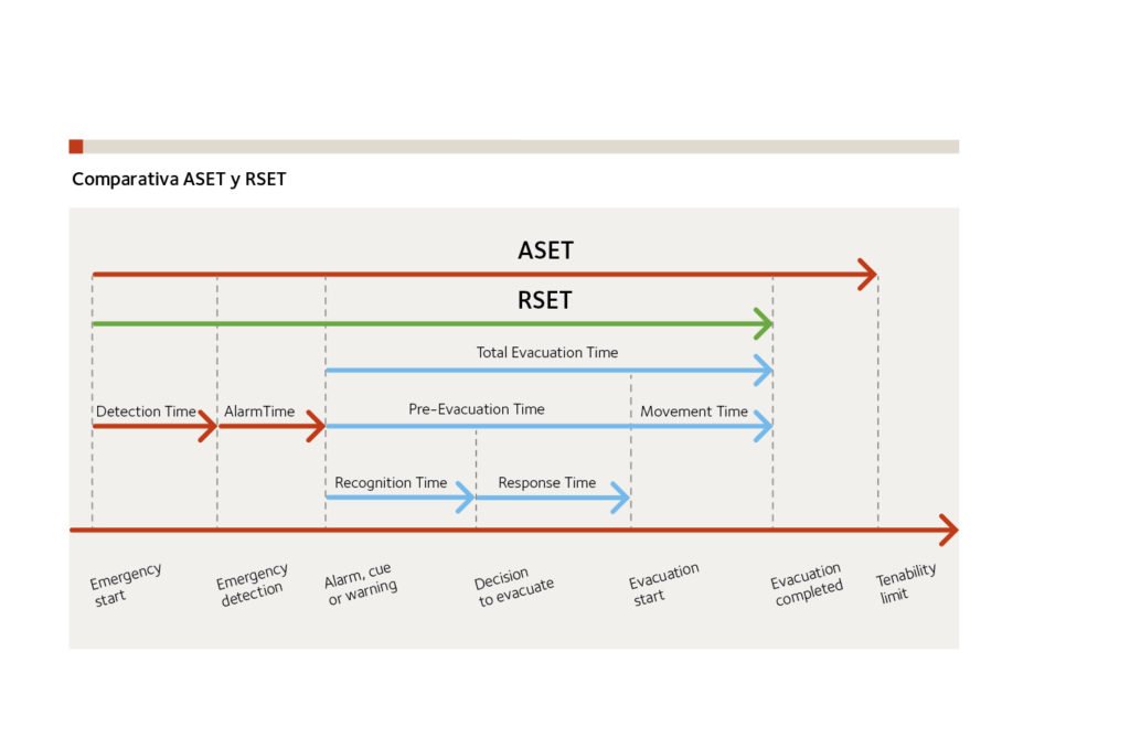 Como parámetro de análisis de la idoneidad de las soluciones estudiadas se utiliza el tiempo necesario para la evacuación de cada zona o de llegada a zona segura (RSET) y de tiempo de salida seguro disponible (ASET).